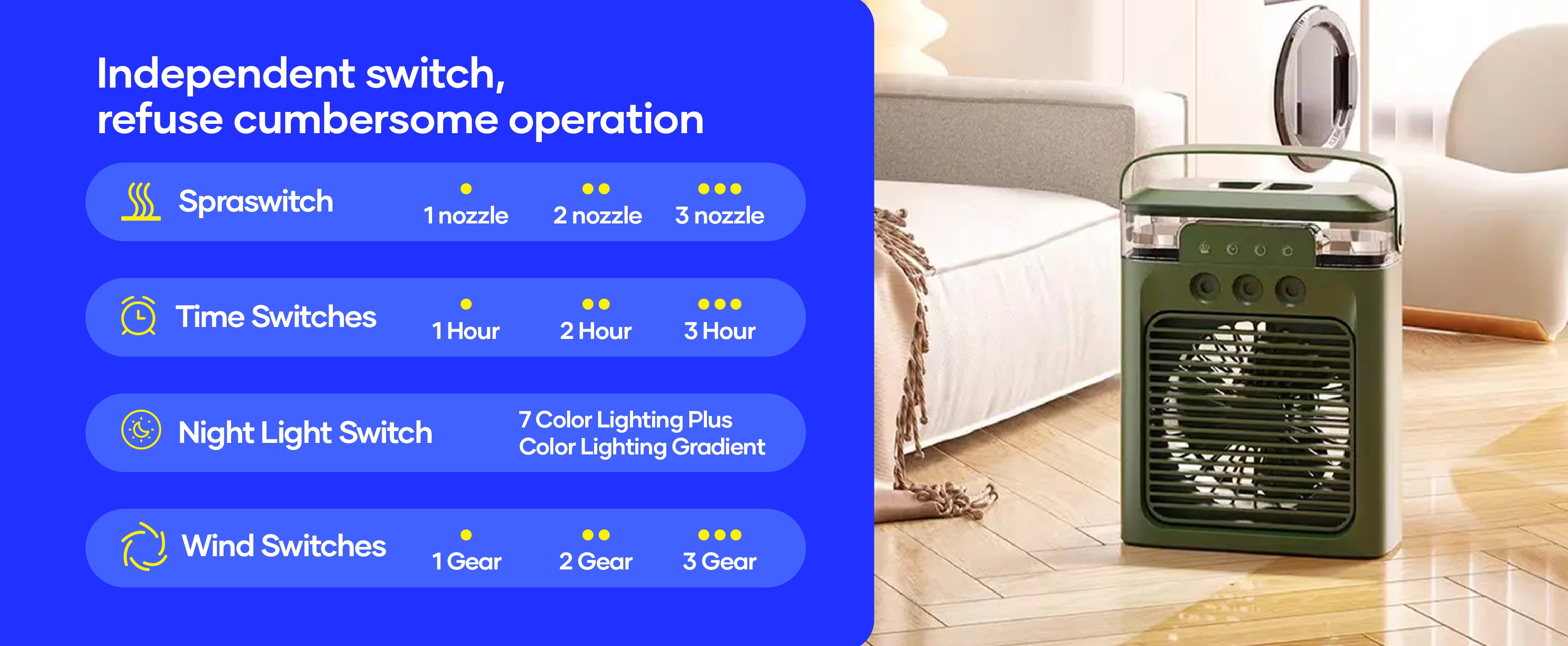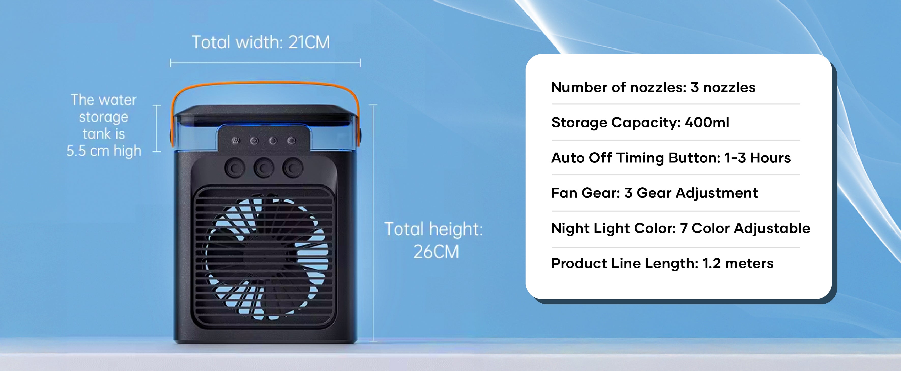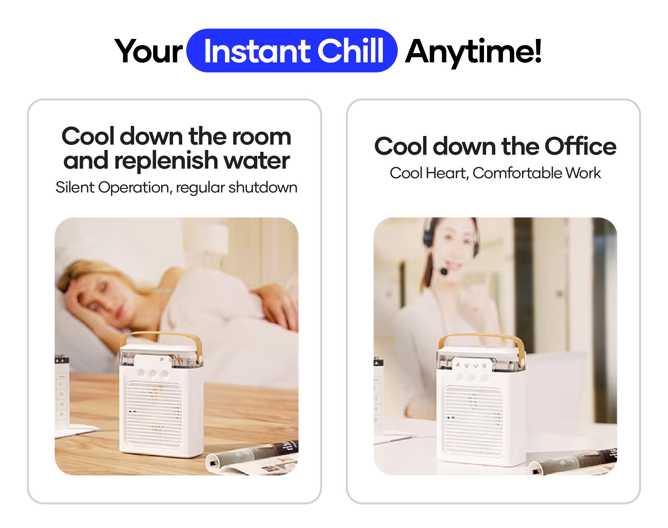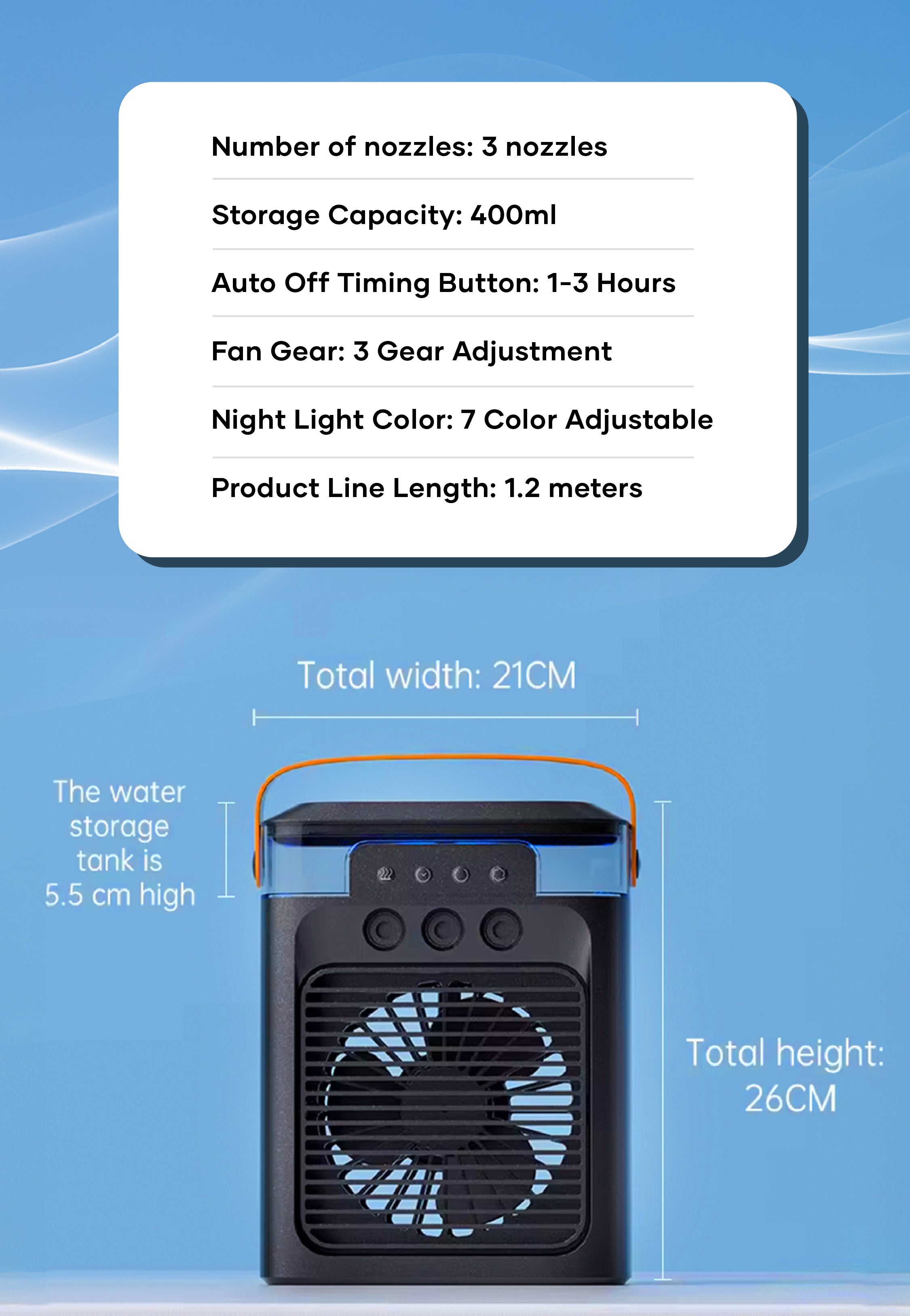 Stay cool this summer with our Portable Mini Air Cooler, compact, energy-efficient, and perfect for any space. Enjoy 3-in-1 functionality with cooling, fan, and humidifier modes. Beat the heat anytime, anywhere!